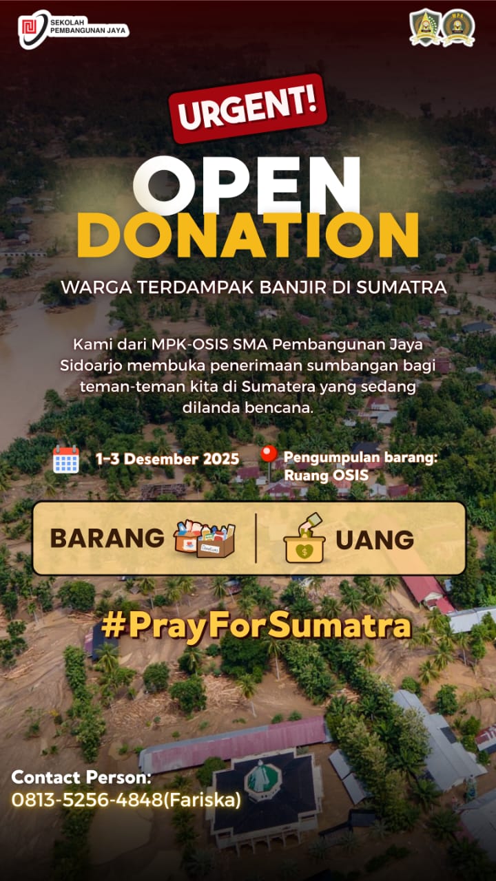 Kami dari OSIS-MPK menyampaikan bahwa kami membuka penerimaan sumbangan serta penggalangan dana bagi teman-teman kita yang sedang dilanda bencana di Sumatera yang akan dilaksanakan tanggal 1-3 Desember 2025, yang nantinya akan disalurkan oleh BPBD Jawa Timur kepada pihak yang membutuhkan.