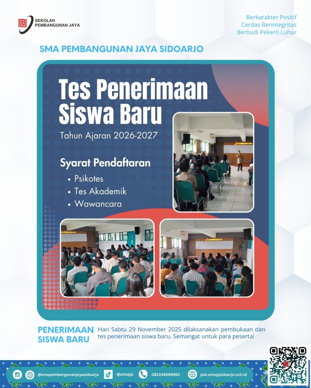 Hari ini SMA Pembangunan Jaya Sidoarjo resmi membuka rangkaian Tes Penerimaan Siswa Baru Tahun Ajaran 2026–2027!
