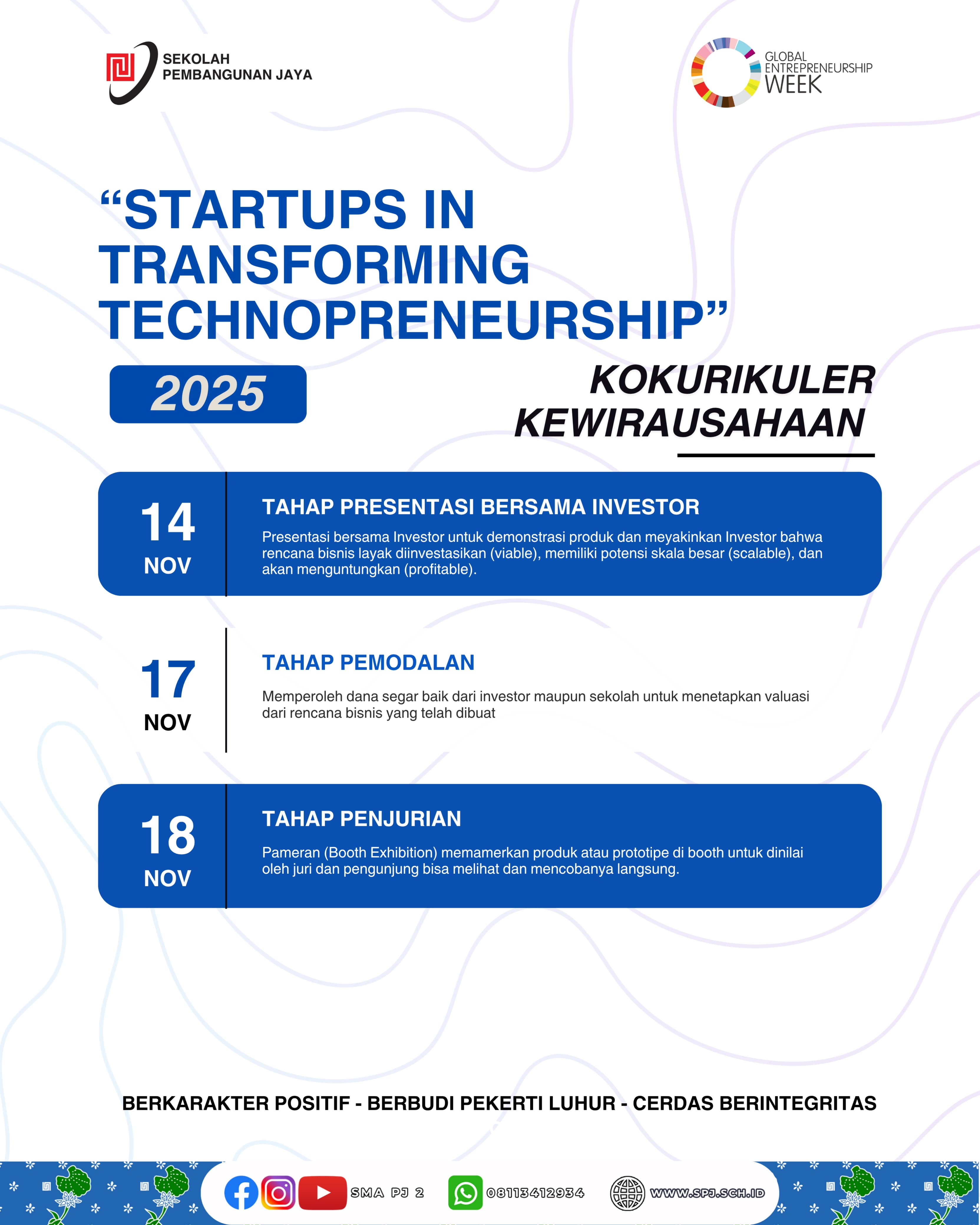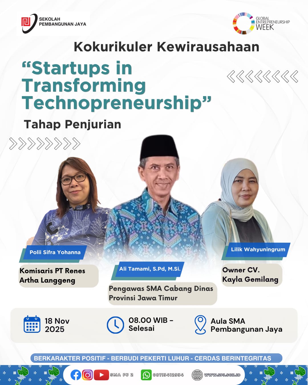 SMA Pembangunan Jaya dengan bangga menyelenggarakan Tahap Penjurian dalam rangkaian kegiatan “Startups in Transforming Technopreneurship”.