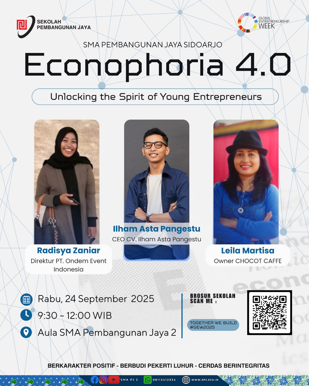 Econophoria 4.0 hadir di SMA Pembangunan Jaya Sidoarjo sebagai ruang belajar, berbagi, dan berinovasi bersama para praktisi muda inspiratif.