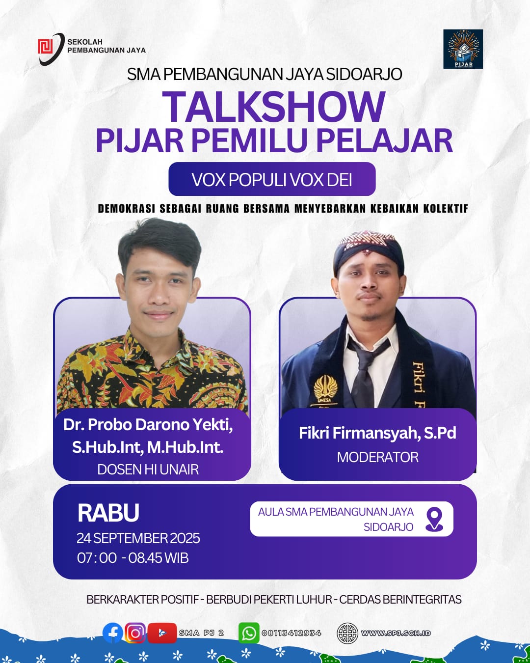 Demokrasi bukan hanya tentang memilih, tapi tentang bagaimana kita hadir, mendengar, dan bergerak bersama. Mari ikuti Talkshow Pemilu Pelajar (PIJAR):