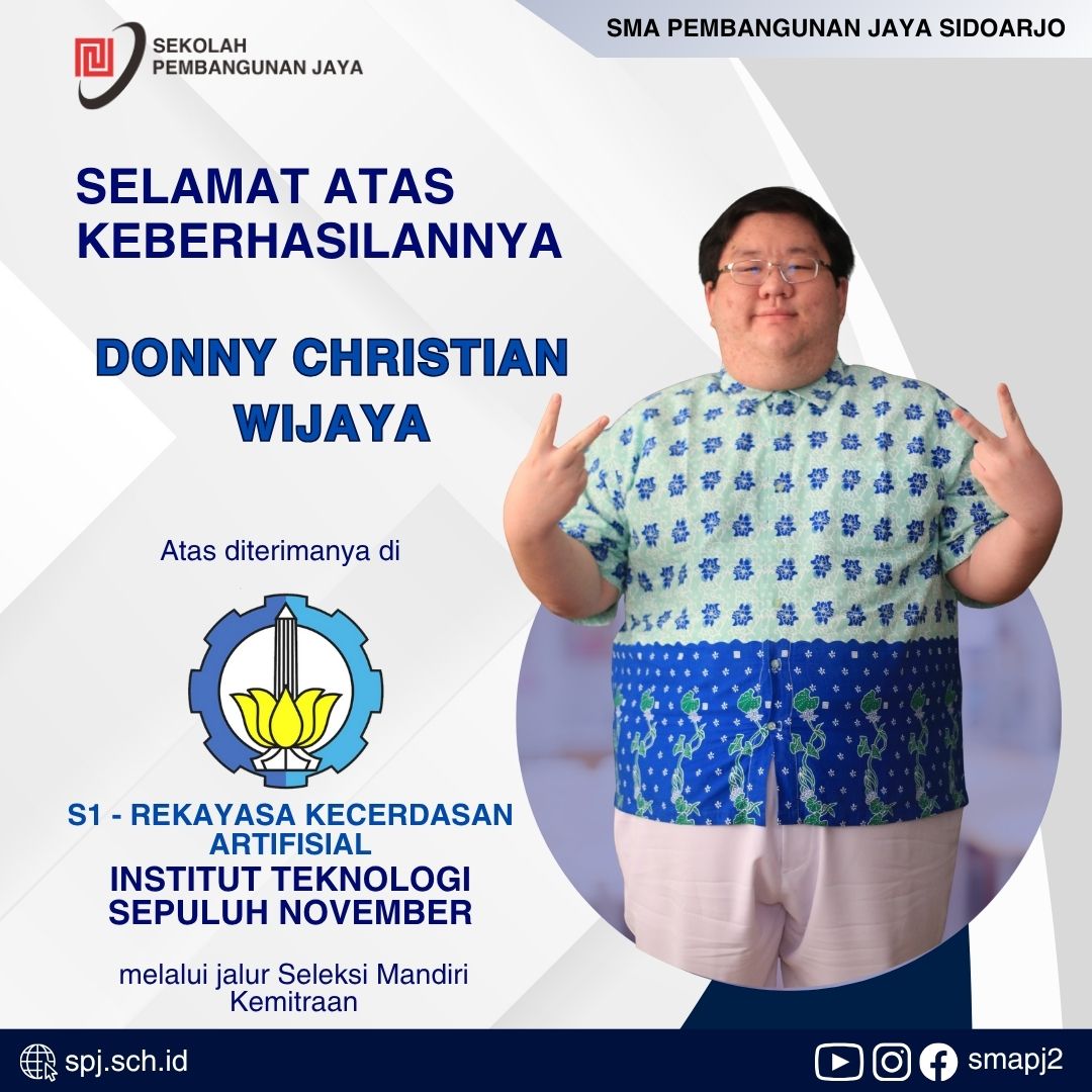 Dari SMA Pembangunan Jaya Sidoarjo menuju ITS, Donny membuktikan bahwa kerja keras, konsistensi, dan semangat belajar bisa membawa ke puncak prestasi! ?✨